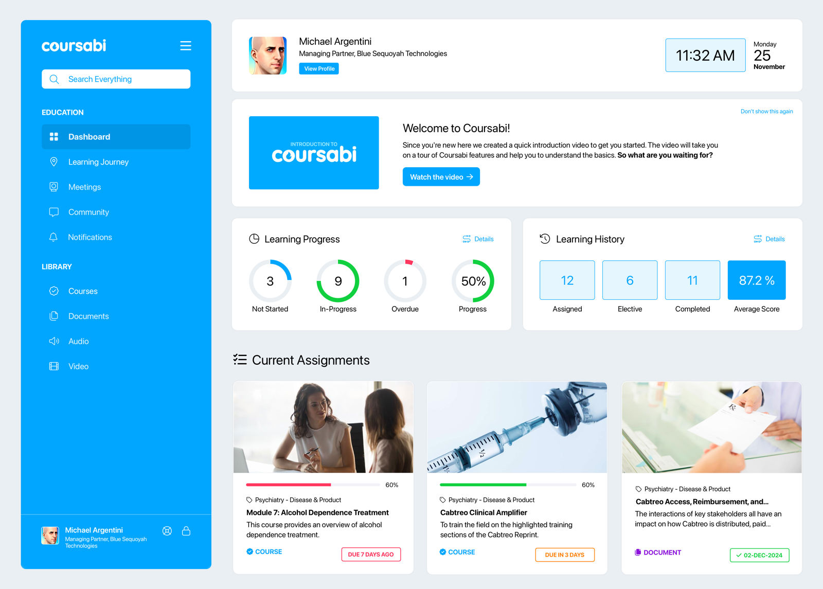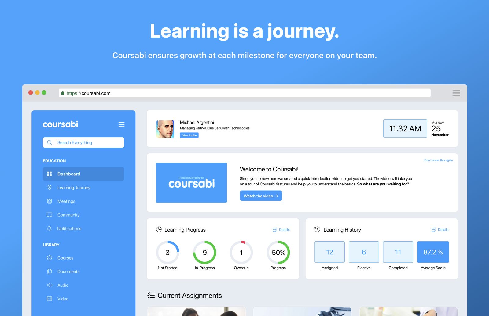 Fynydd partnered with Blue Sequoyah Technologies to build a community-driven learning platform named Coursabi, which gives learners a simple but powerful way to grow as they follow their learning journey. Their dashboard shows them progress to-date and what assignments are next. They can explore the content library for elective learning, sign documents, and complete forms. And the community gives them a way to learn from peers and content authors.